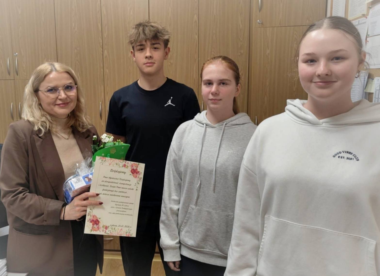 Delegacja Samorządu Uczniowskiego zrobiła miłą niespodziankę pani pracującej w szkolnym sekretariacie, składając życzenia z okazji przypadającego 25 stycznia Dnia Sekretarki i Asystentki