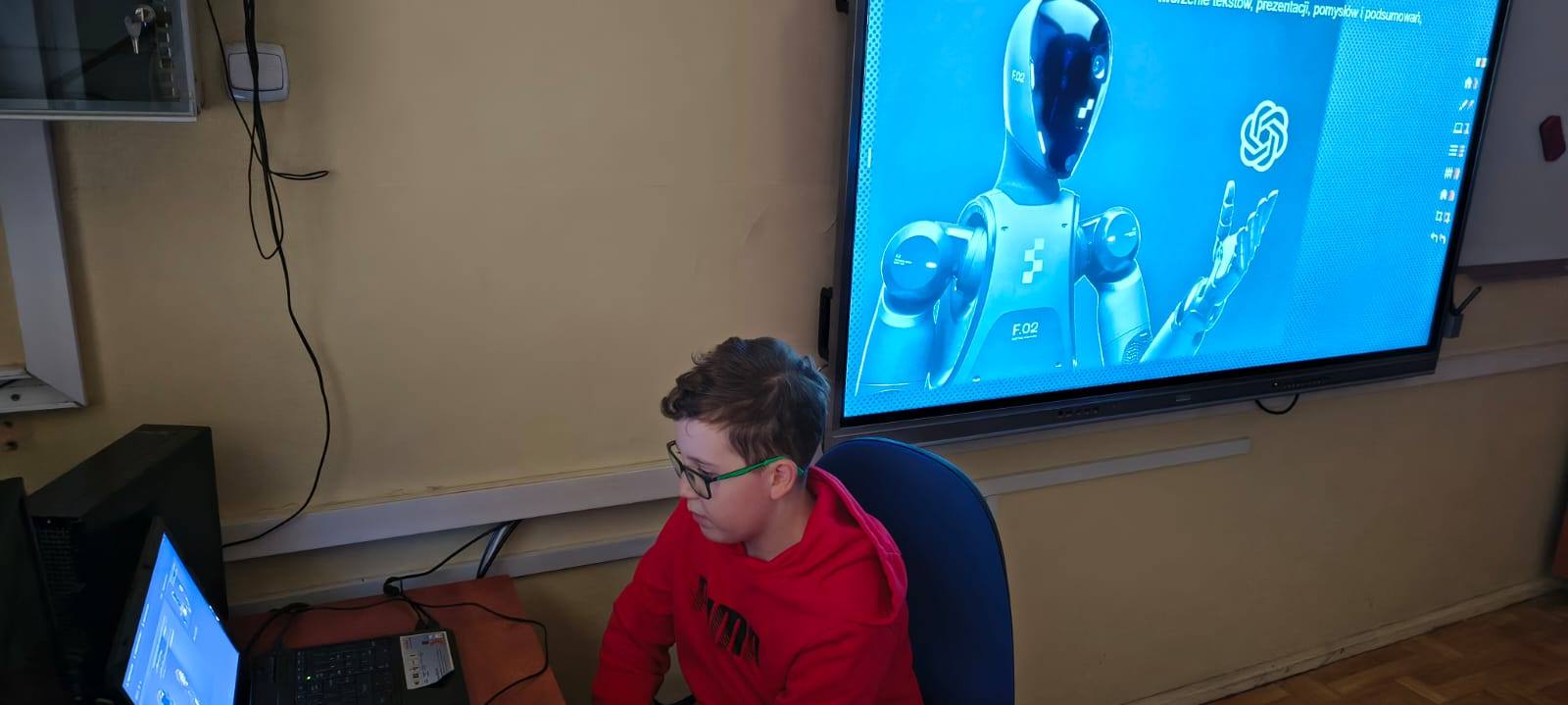 Na lekcji informatyki w klasach 6 i 7 omawiano temat ChatGPT oraz sztucznej inteligencji. Uczeń klasy 7 Adam Sedlaczek przedstawił prezentację na temat czatu ChatGPT, wyjaśniając, czym jest oraz do czego może być wykorzystywany.