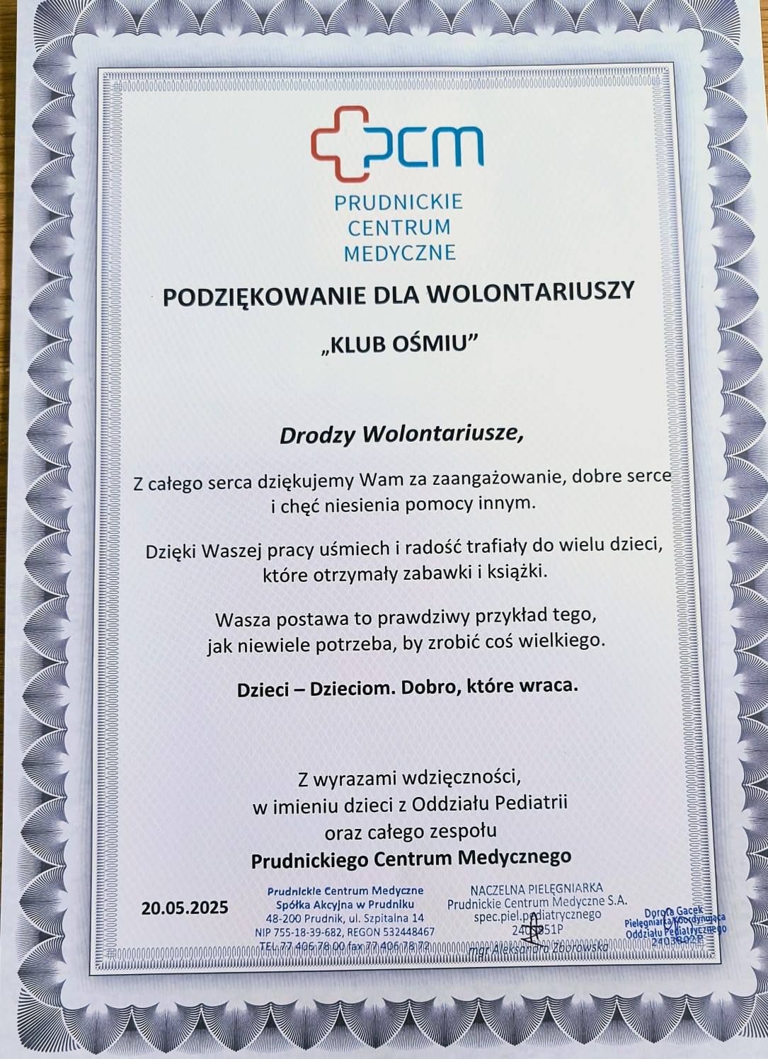 Szkolny wolontariat "Klub Ośmiu" pragnie serdecznie podziękować wszystkim uczniom i rodzicom za wsparcie zbiórki na Oddział Pediatryczny znajdujący się w Prudnickim Centrum Medycznym S.A.